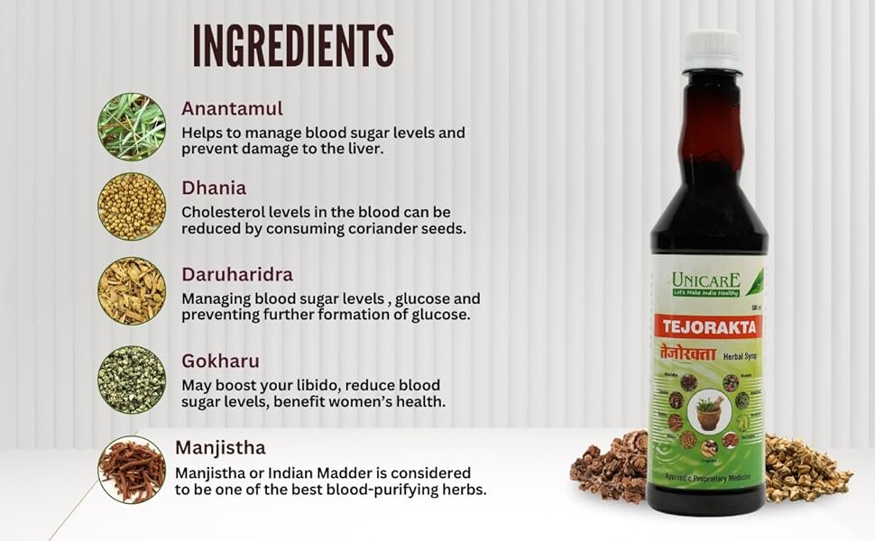 Unicare’s Tejorakta Herbal Syrup is made from a synergistic blend of Ayurvedic herbs that not only purify the blood but also improve digestion, strengthen immunity, and promote overall wellness — offering a holistic solution.