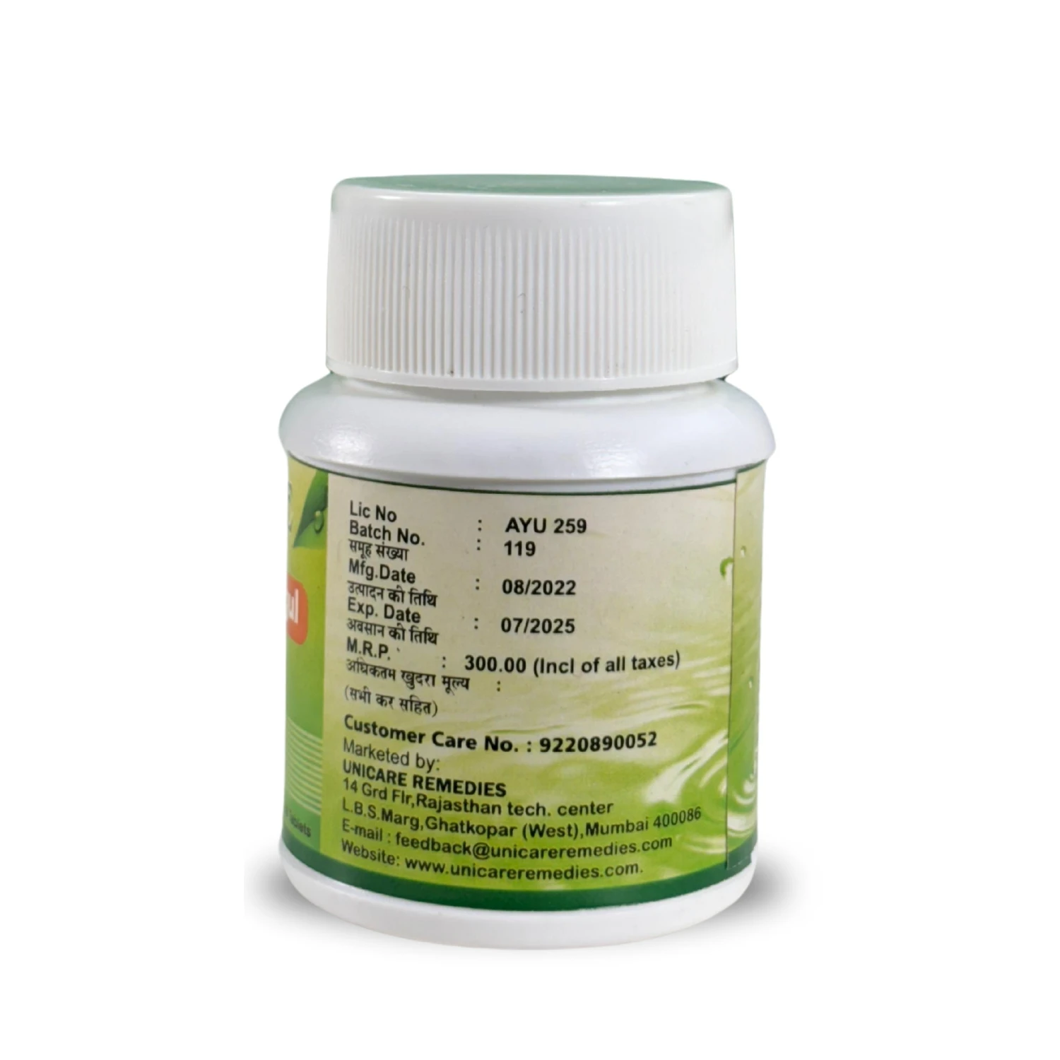 Unicare’s Triphala Guggul combines Triphala (Amla, Haritaki, Bibhitaki) and Guggulu resin with supportive herbs like Pipali. It balances Vata-Pitta doshas, stimulates digestion (Agni), acts as a mild laxative, and reduces inflammation – making it effective for piles (hemorrhoids), anal fistula, constipation, and digestive disorders